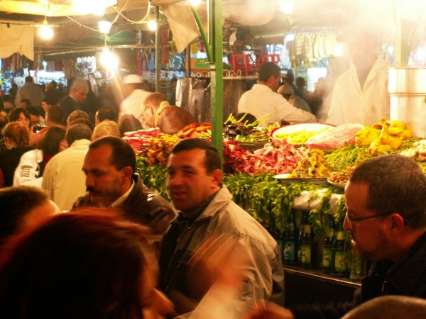 their seats. After a couple of laps I decide on stall 25 with its piles of kebabs, fish, sausages and salad. Lunch and a drink comes to 80dh (£5) the